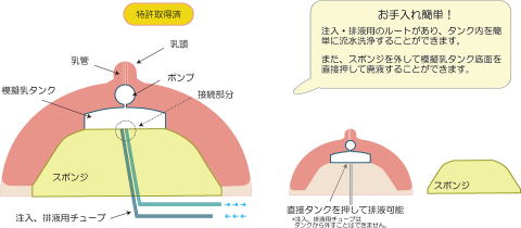 注入、排液それぞれのルートがあり、洗浄が容易です。また、本体裏の乳房実質部を外し直接模擬乳タンクを押して、タンク内の排液を行うことができます。