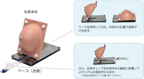母乳育児支援を学ぶ上で必要な、乳汁の分泌状態の観察、また、用手搾乳技術を習得するための乳房モデルです。形状は臨地実習で出会うことが多い、産褥早期の乳房を想定しています。技術習得に加え、男子学生の体験学習、また妊婦や褥婦への指導時にも使用できるモデルです。